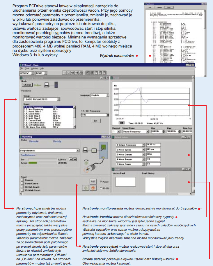 Program FCDrive stanowi łatwe w eksploatacji narzędzie do uruchamiania falownika Vacon. Przy jego pomocy można odczytać parametry z przemiennika, zmienić je, zachować je w pliku lub ponownie załadować do przemiennika, wydrukować parametry na papierze lub drukować do pliku, ustawić wartości zadające, spowodować start i stop silnika, monitorować przebiegi sygnałów (strona trendów), a także monitorować wartości bieżące. Minimalne wymagania sprzętowe dla zastosowania programu FCDrive, to: komputer osobisty z procesorem 486, 4 MB wolnej pamięci RAM, 4 MB wolnego miejsca na dysku oraz system operacyjny Windows 3.1x lub wyższy.
