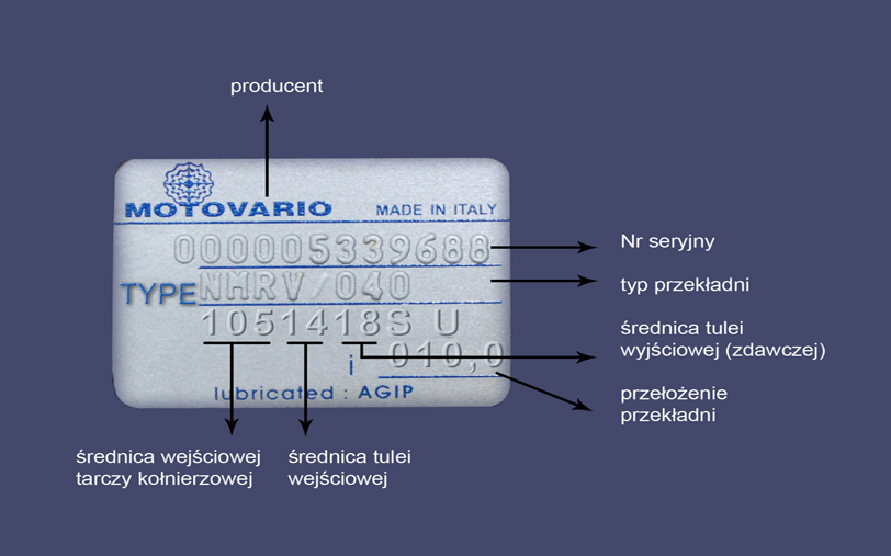 Tabliczka znamionowa, to „metryka” przekładni, a właściwie każdego urządzenia przemysłowego (maszyny, urządzenia, aparatu, środka transportu) zawiera najważniejsze informacje techniczne, dotyczące funkcjonowania i budowy produktu oraz określa granice jego zastosowania zawarte w umowie. Zawarte na niej dane pozwalają dobrać zamiennik urządzenia bądź zakupić to samo urządzenie (w przypadku jego awarii).